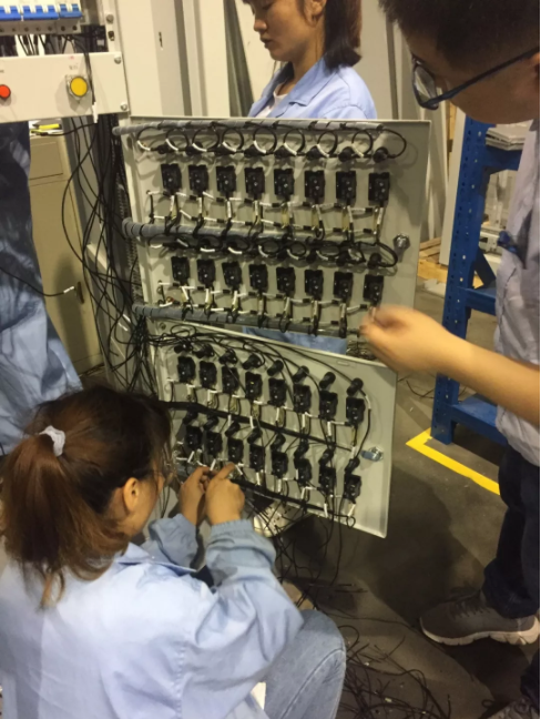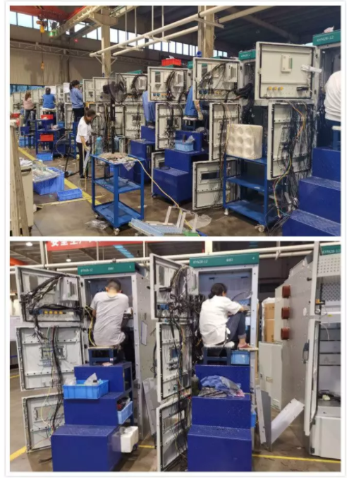 新疆阿克塔木17臺KYN28柜項(xiàng)目生產(chǎn)現(xiàn)場,在工藝要求極高,二次線頭數(shù)平均約1200個的情況下,二次線班組堅(jiān)持一人一臺的有序工作安排,最終用3天時間完成了生產(chǎn)任務(wù)!
