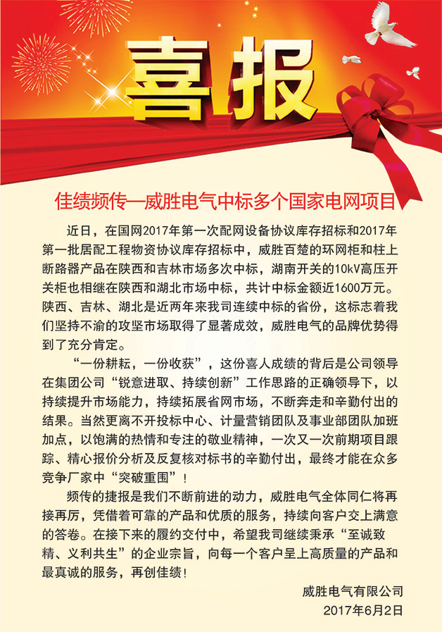 近日,在國網(wǎng)2017年第一次配網(wǎng)設(shè)備協(xié)議庫存招標(biāo)和2017年第一批居配工程物資協(xié)議庫存招標(biāo)中,威勝百楚的環(huán)網(wǎng)柜和柱上斷路器產(chǎn)品在陜西和吉林市場多次中標(biāo),湖南開關(guān)的10kV高壓開關(guān)柜也相繼在陜西和湖北市場中標(biāo),共計中標(biāo)金額近1600萬元。陜西、吉林、湖北是近兩年來我司連續(xù)中標(biāo)的省份,這標(biāo)志著我們堅持不渝的攻堅市場取得了顯著成效,威勝電氣的品牌優(yōu)勢得到了充分肯定。