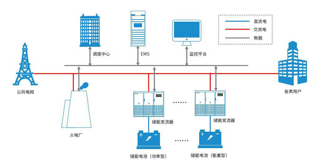 本方案用于電力輔助服務或傳統電網升級方式變革,具體形式可為調峰調頻電站、城市儲能電站等。