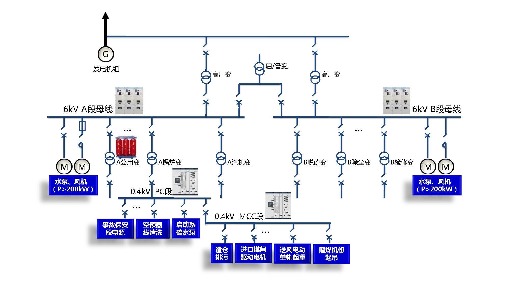 中壓系統(tǒng)通過中低壓廠用變壓器,供電給廠用電低壓動(dòng)力設(shè)備和照明、檢修等。低壓廠用電系統(tǒng)通常采用動(dòng)力中心PC、電動(dòng)機(jī)控制中心MCC供電方式。對(duì)于PC和MCC供電,威勝電氣提供通過全型式試驗(yàn)的西門子授權(quán)SIVACON 8PT低壓配電柜、施耐德授權(quán)Blokset低壓配電柜、MNS低壓配電柜,滿足低壓配電線路保護(hù)和電動(dòng)機(jī)保護(hù)控制要求。