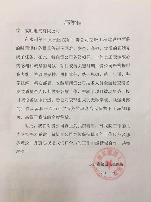 近日,威勝電氣收到了永州市第四人民醫(yī)院發(fā)來的表揚信,感謝我公司的優(yōu)質(zhì)服務(wù)。