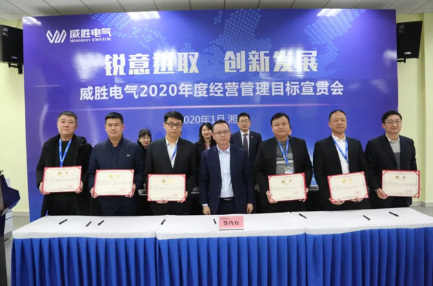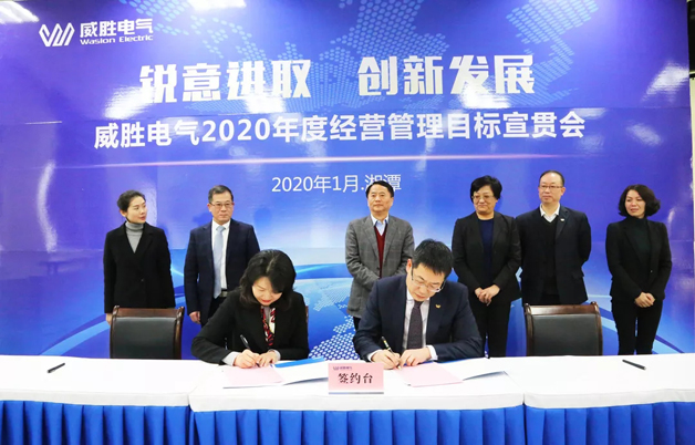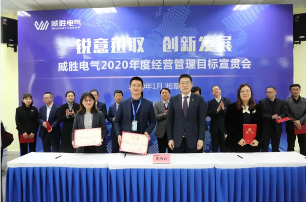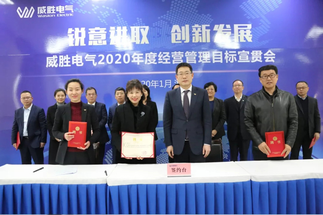 威勝電氣總裁曾辛先生鄭重向電氣董事長(zhǎng)曹總簽署2020年目標(biāo)承諾書