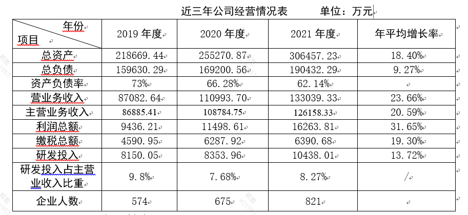 截止2021年12月31日,公司總資產(chǎn)306457.23萬元,負(fù)債率62.14%,營業(yè)收入133039.33萬元,利潤總額16263.81萬元,繳納稅費6390.68萬元,研發(fā)投入10438.01萬元,占比主營業(yè)收入8.27%。公司近三年經(jīng)營情況如下: