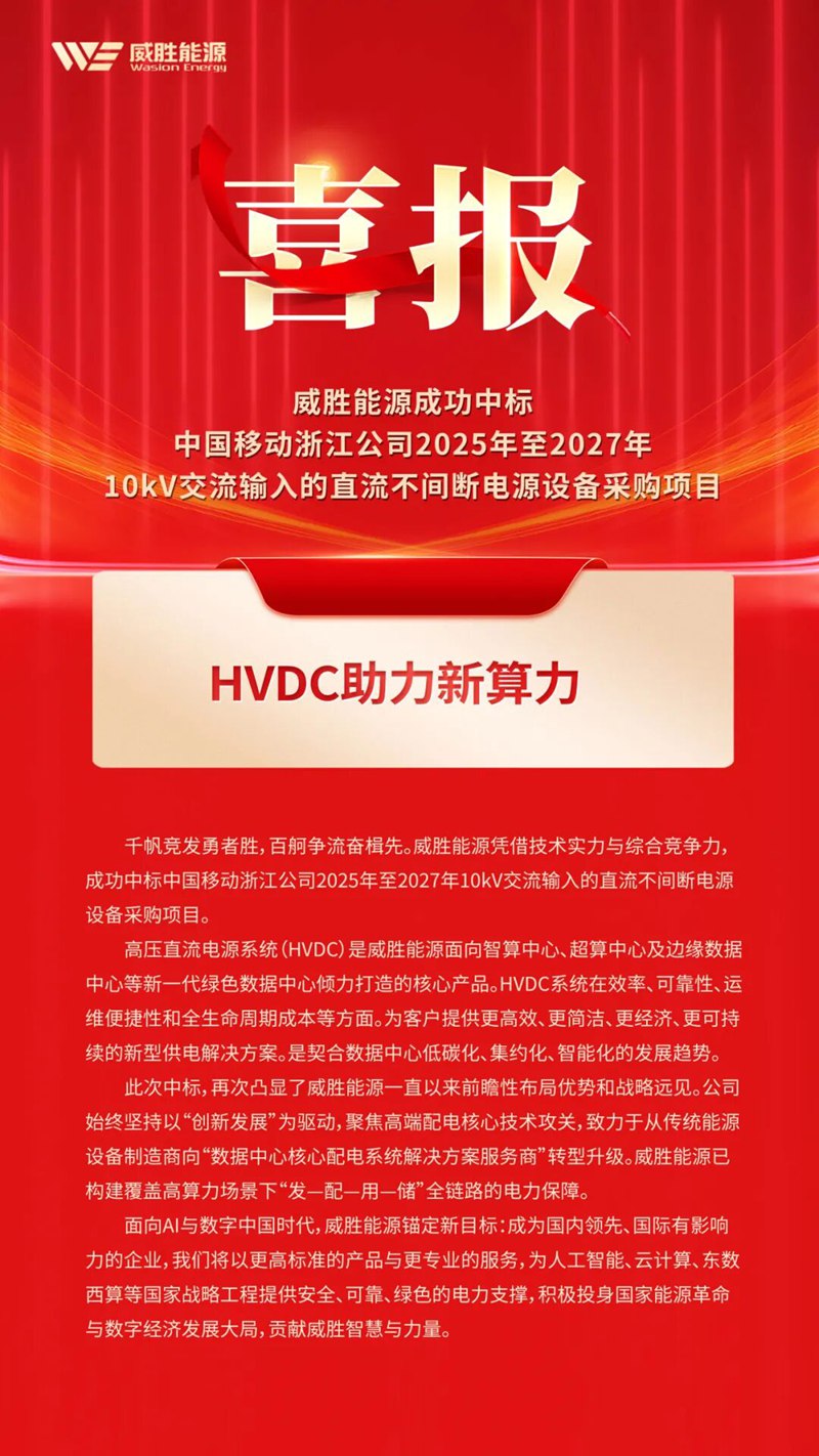 千帆競發(fā)勇者勝,百舸爭流奮楫先。威勝能源憑借技術實力與綜合競爭力,成功中標中國移動浙江公司2025年至2027年10kV交流輸入的直流不間斷電源設備采購項目。