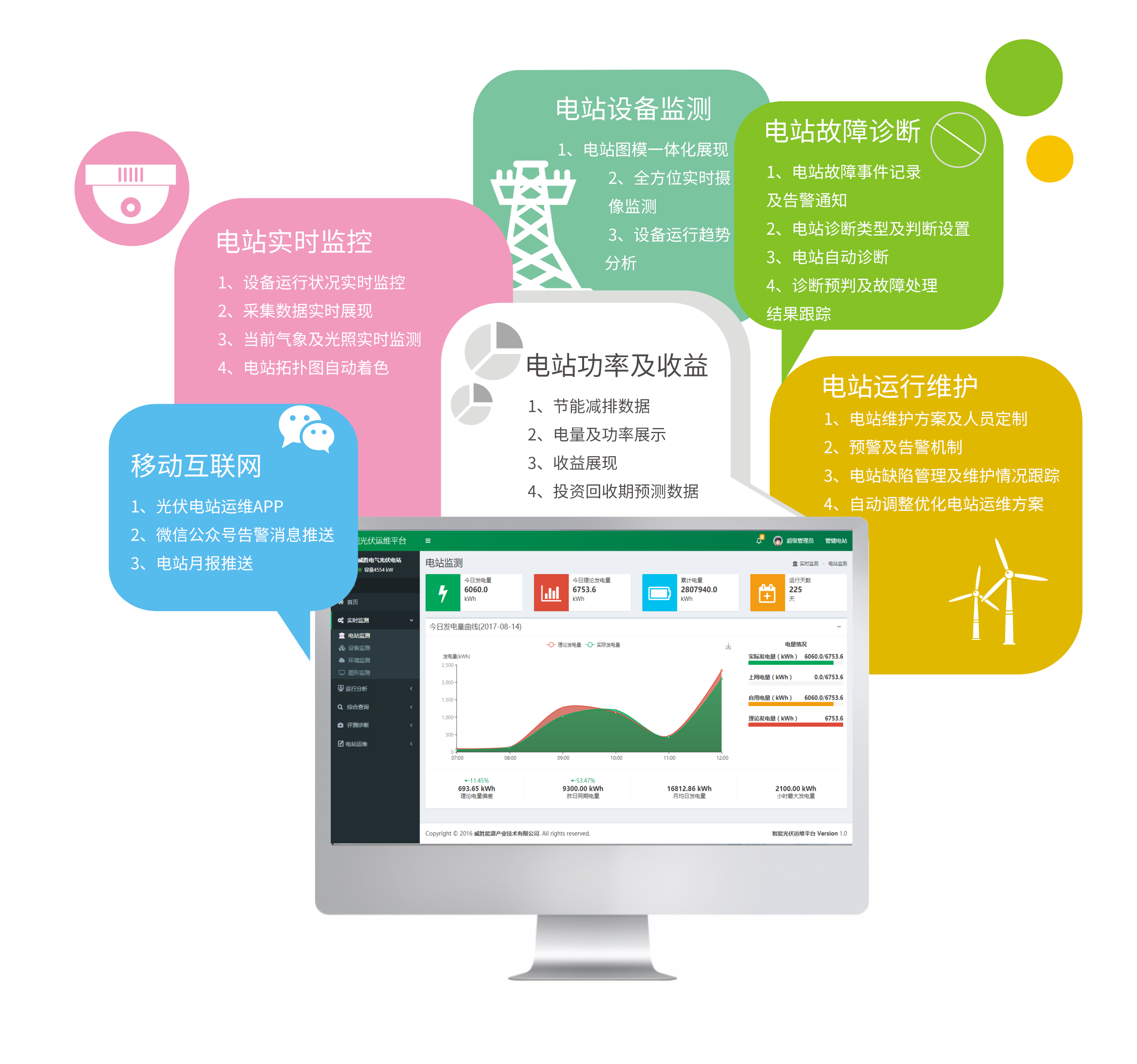 智能光伏電站管理系統立足于光伏發電運維市場,通過智能化的解決手段進行電站優化,提高光伏發電效益,以增強發電量為目的,最大限度提高電站的運維水平。智能解決方案乘著“互聯網+”這股東風,通過“專業化”+“信息化”的服務方式全方位多渠道支撐電站運維。